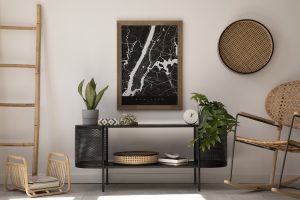 Modern scandinavian home interior with design black commode, moc