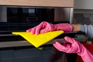 Young woman cleaning oven in the kitchen